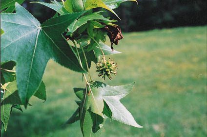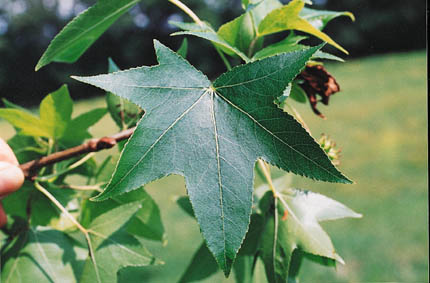 Description: A large tree with a cone-shaped crown common to dominant in bottomlands of the southeastern and eastern U.S. Sweetgum is a handsome tree often planted for shade and for its star-shaped leaves that turn orange to reddish purple in the fall. It is also an important commercial hardwood tree. The gum from the inner bark has a long history of use including chewing-gum, antiseptic and the treatment of skin diseases and dysentery. |