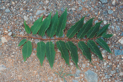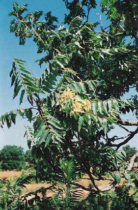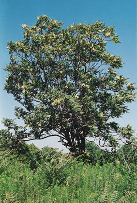 Description: Introduced from China as an ornamental shade tree. Spreads from roots and can escape cultivation. Very hardy, grows in waste places and under adverse conditions. Can cause allelopathic effects on other plants. The leaves, which are ill-smelling when crushed, are poisonous and can cause dermatitis in some individuals when contacted. |