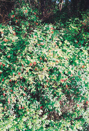 Description: A shrubby, twining, evergreen vine occurring on a variety of sites. Flowers are arranged in whorls and can be red or yellow. Stems can be green to red with mature stems fibrous and gray in color. Planted as an ornamental because of its showy flowers. Fruit is eaten by many species of birds. |