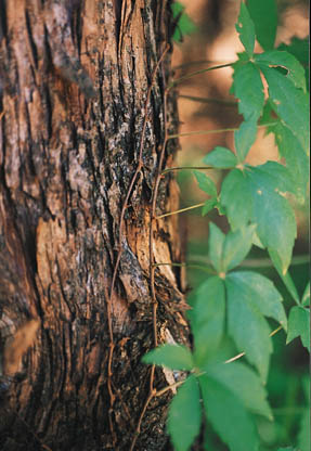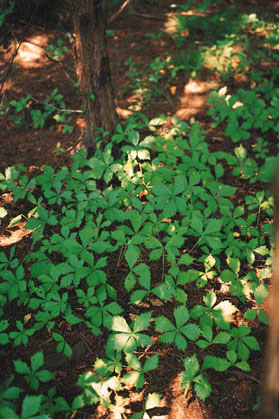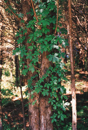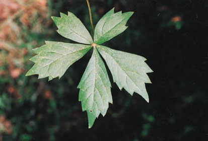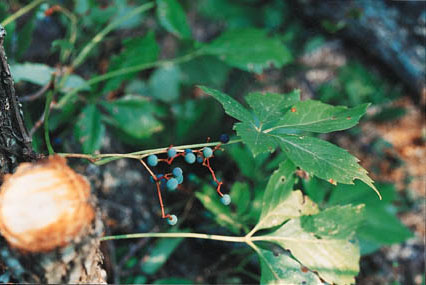 Description: A high climbing or prostrate woody vine. Widespread on a variety of sites, usually climbing trees or trailing along forest floors. A potential ornamental because of its ability to climb walls and its striking red fall foliage. Although it is sometimes confused with Poison-ivy, Virginia-creeper has five to six leaflets and does not cause contact dermatitis. However, the fruit is reportedly poisonous and the plant tissues contain microscopic, needle-like crystals that can cause irritation. The fruit is eaten by squirrels and many species of birds. |
