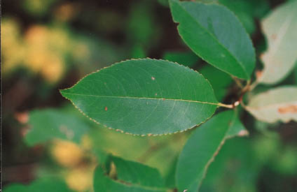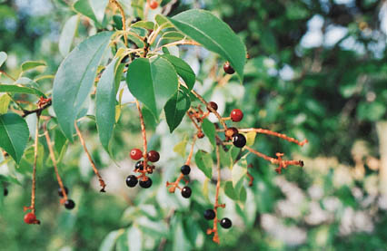 Description: A medium-sized tree found in bottomlands and the moist soil of uplands. Sometimes used as an ornamental. One of the largest species in the Prunus genus native to the United Sates. Fruit is black when ripe and is eaten by many species of birds and mammals. The slightly bitter juicy pulp is edible although the seeds are reportedly poisonous. Wilted leaves can be poisonous to cattle due to prussic acid. |