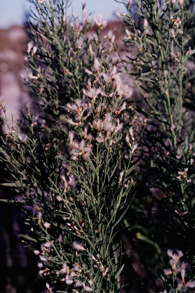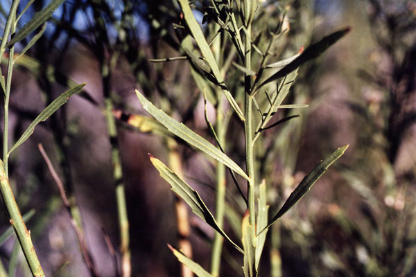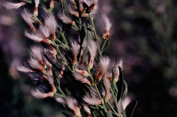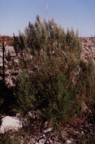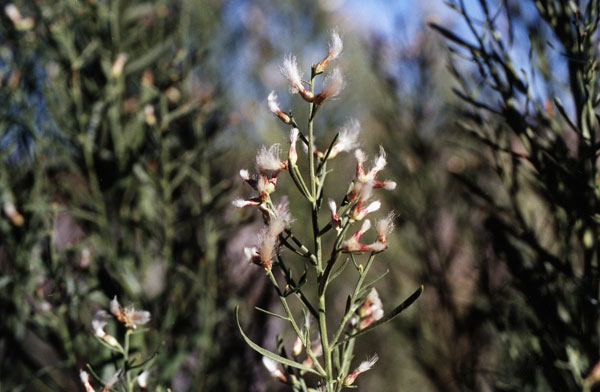 Description: A shrub occurring in open areas usually on calcareous soils. This species has linear leaves as opposed to the elliptic or obovate shaped leaves of B. halimifolia. The white cotton-like pappus of the fruit is very conspicuous in the fall and is distributed by wind. Closely related to B. salicina (Willow baccharis).
