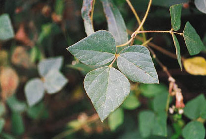 Description: A broad, trifoliate leafed legume with a somewhat vinelike, prostrate growth form. Uncommon in woods from central Oklahoma and Texas eastward. One of three species in this genus and the only one occurring in North America. The other two are of Asian and African origin. |