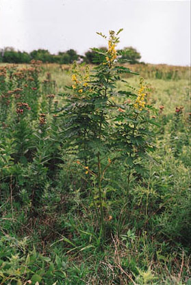 Description: A legume with yellow flowers in late July through September. Uncommon along roadsides, fence rows, pastures and open woods. Similar in appearance to Partridge pea, Cassia fasciculata, but with larger leaves, fruits and narrow, often curled flower petals. |
