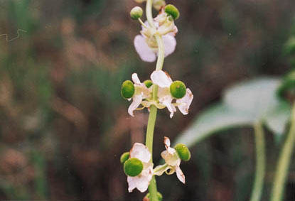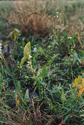 Description: An upright to spreading aquatic plant that grows from tuber-bearing roots. Common in water or muddy areas. Flowers are generally in whorls of three on a long spike. The tubers are eaten by ducks and other wildlife, hence the common name "Duck potato". |