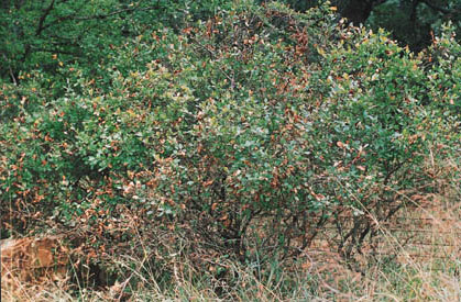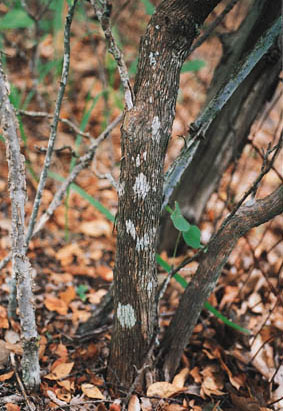 Description: A large shrub with stiff branches or sometimes small tree occurring in the understory of forests on dry, sandy and rocky uplands. The bark is thin and scaly, shredding into large plates, and is reddish brown in color. The fruits are shiny black when mature in the fall and may remain attached into winter. Mature fruit is eaten by many species of birds and some mammals and can be consumed by humans as well. The wood is dense and hard. Also commonly called Huckle-berry or Sparkle-berry. |