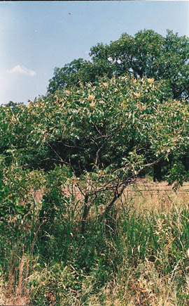 Description: A shrub or occasionally a small tree, usually forming thickets, widespread in open uplands along fence rows and in unused areas. A prolific sprouter after fire. Leaves have a winged axis and turn flame red to dark purple in the fall, hence the common name. Fruit matures in late summer, remaining attached into winter, and is eaten by many species of birds and white-tailed deer. White-tailed deer and some livestock use it as a browse. Sometimes used in native landscaping. The small fruits can be crushed in water to make a tart drink. |