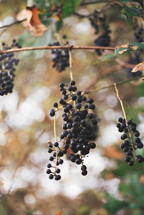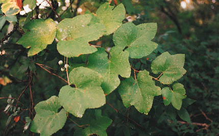 Description: A vigorous, clump forming or high-climbing woody vine with shreddy bark occurring on moist sandy soils in bottomlands and uplands, usually along fence rows, roadsides and in woods. Fruits are eaten by many birds and mammals, and can be used to make jelly. Also commonly called Summer or Pigeon grape. |