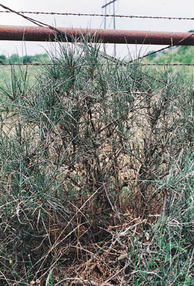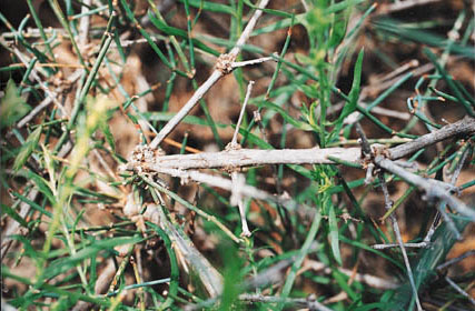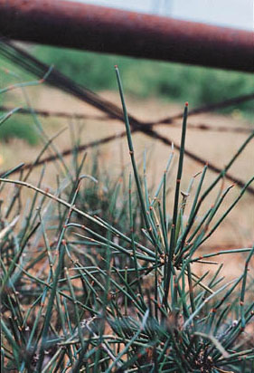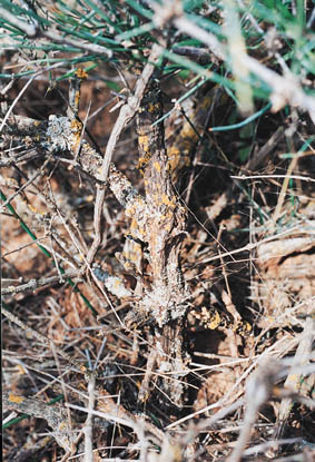 Description: An erect, spreading shrub with opposite or whorled branches found on dry gravelly soils in semi-arid areas. There is a narrow, pale, orange-yellow band encircling the stem just below where the leaves attach to the node. The fruit, tiny cones, are located at the nodes of the branches. The Latin name antisyphilitica refers to the plant's historic use in the treatment of syphilis. Also commonly called Mormon-tea. |