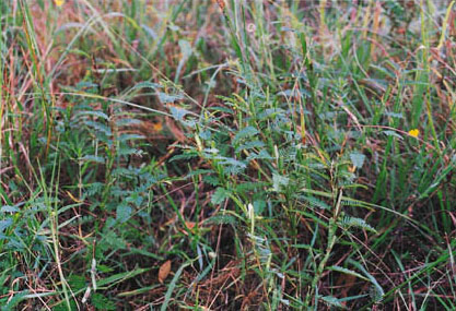 Description: A small, spreading legume with slender stems found on sandy soils in disturbed places, fields and woods. Leaves may close partially when touched. |